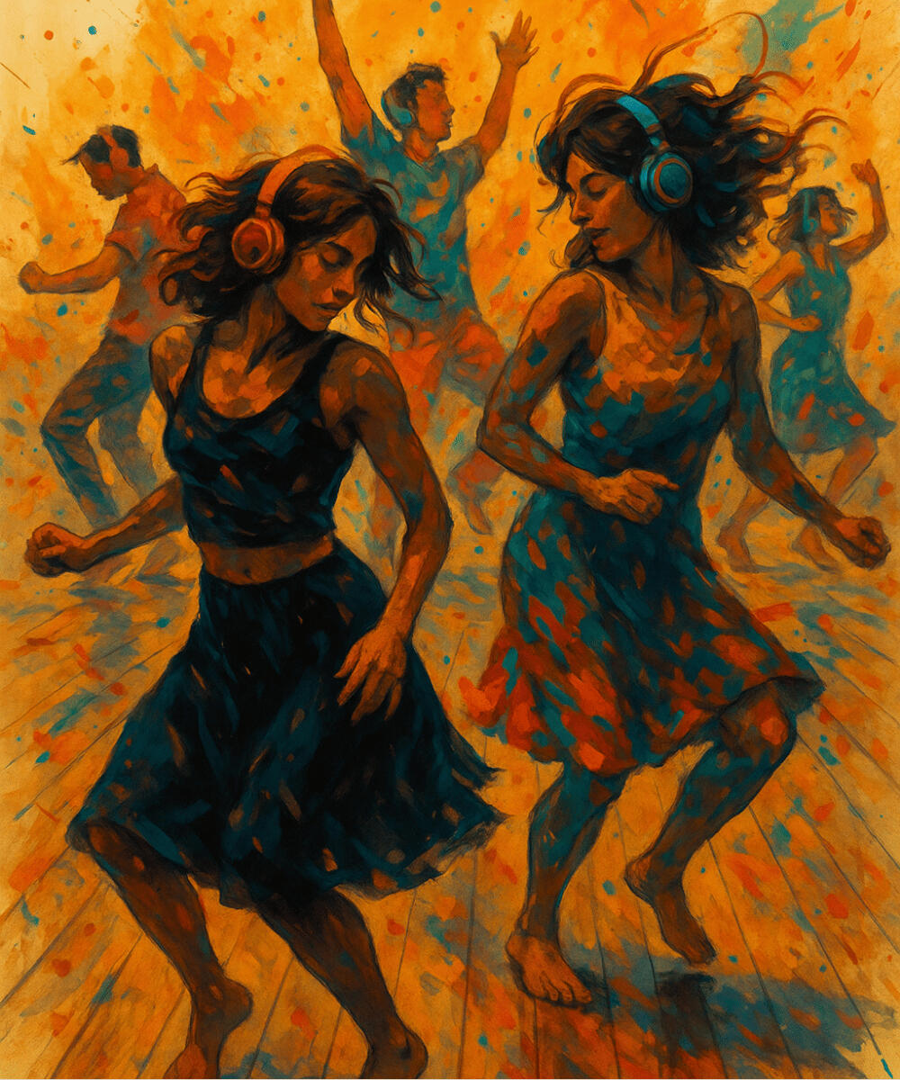 - We begin with a meditation. This helps shift from daily life and into the dance space and encourages presence and a calming of the nervous system.- We dance with wireless headphones. It can help dancers drop into their bodies faster. People often describe the experience as being deeply immersive.- We go on a journey through various styles of music from across the world. This takes us on a wave of energies from slow and spacious, flowing, building into tribal rhythms, electronic and ecstatic peaks, then settling back down into deep calm and stillness.- Integrate - where we take time to connect after the dance in a circle with the option to share. This is a beautiful way to finish, reconnecting the group energy and helping the transition back to everyday awareness.